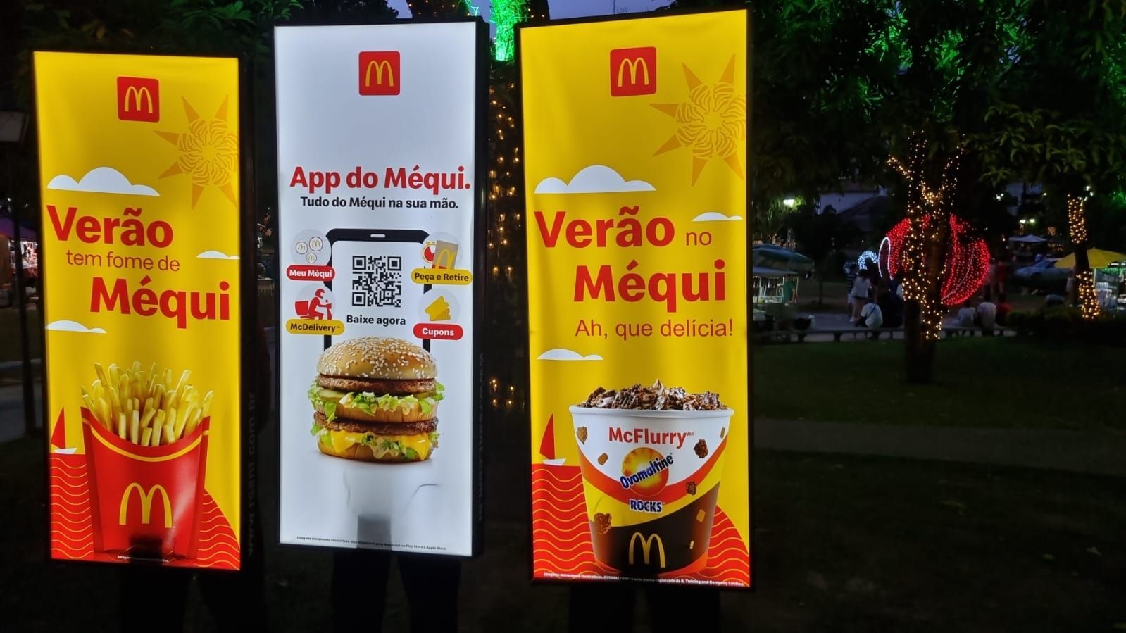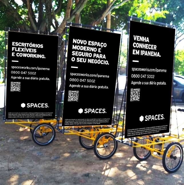 Bicicletas tricoclo com painel publicitário dupla face na medida de 1,05 x 1,80m. Lonas front light que podem conter informações iguais ou variadas em sequencial. Circulação de mínimo de 03 bikes